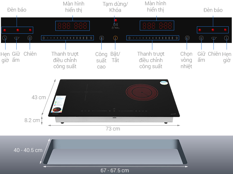 - Tổng công suất 4000W, vùng từ 1800/2300W, vùng hồng ngoại 700/1700W.